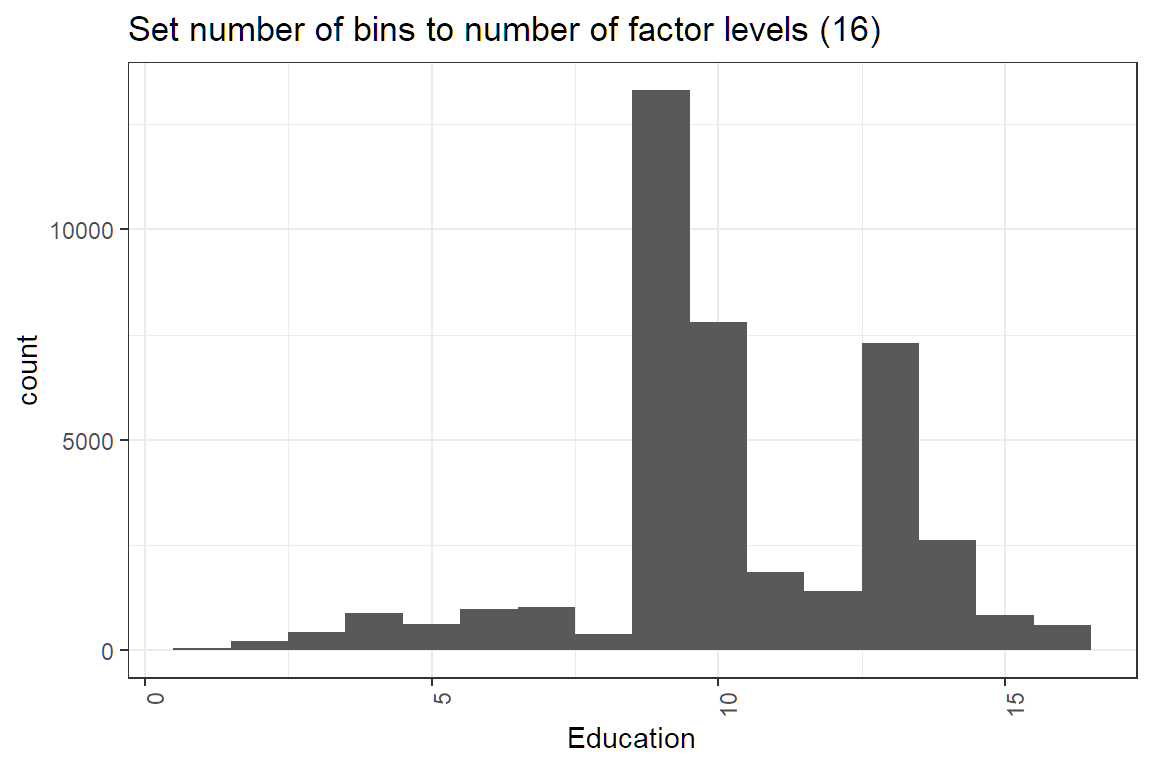 ggtitle("Set number of bins to number of factor levels (16) ")