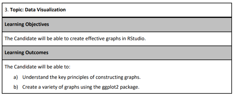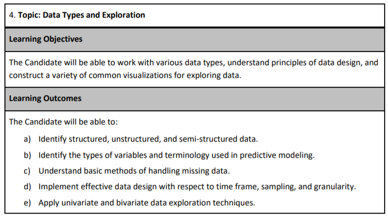 Only four types of graphs are used for data exploration. You will only need to understand how to interpret them. The SOA will provide you with the code needed to create them. There will not be enough time for you to make your graphs.
