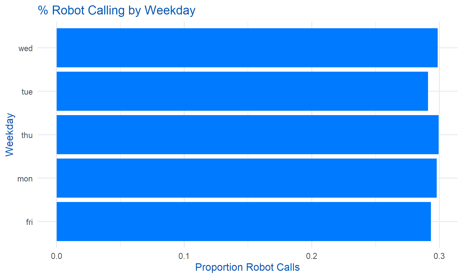 labs(title = "% Robot Calling by Weekday", x = "Weekday", y = "Proportion Robot Calls") +