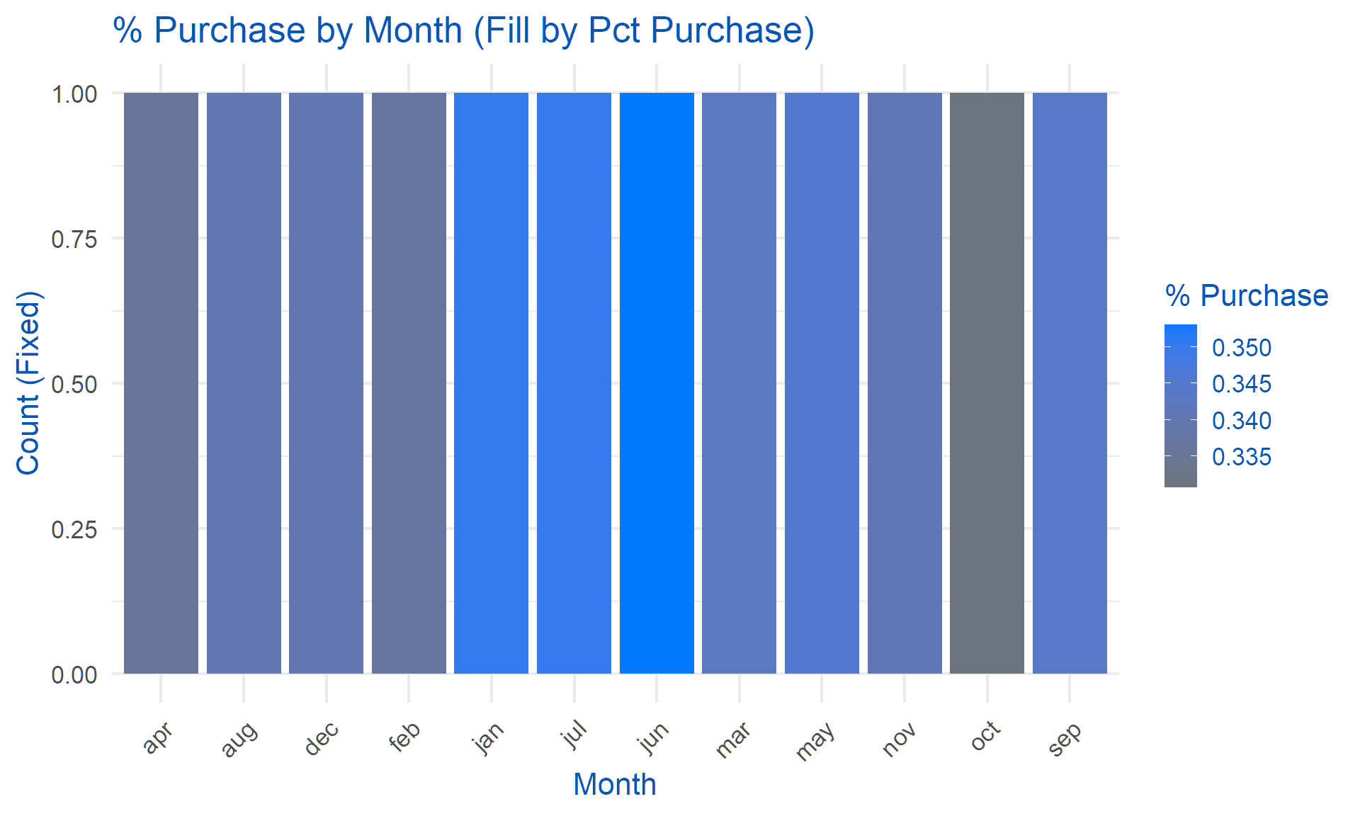 labs(title = "% Purchase by Month (Fill by Pct Purchase)", x = "Month", y = "Count (Fixed)", fill = "% Purchase") +