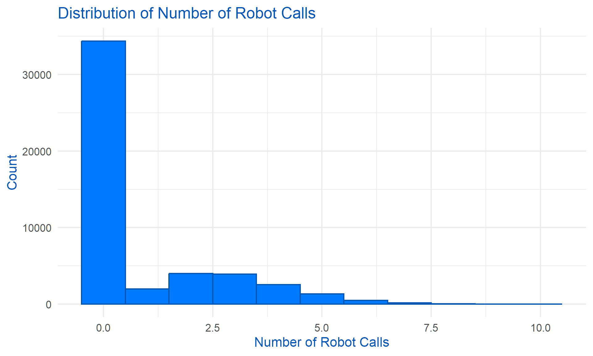 labs(title = "Distribution of Number of Robot Calls", x = "Number of Robot Calls", y = "Count") +