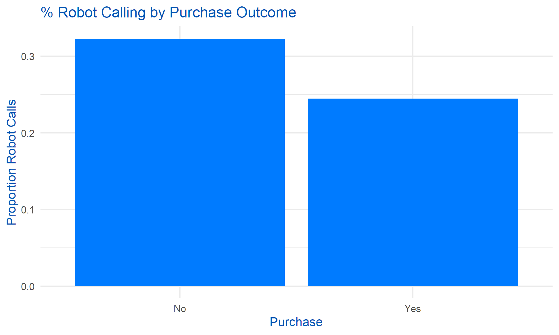 labs(title = "% Robot Calling by Purchase Outcome", x = "Purchase", y = "Proportion Robot Calls") +