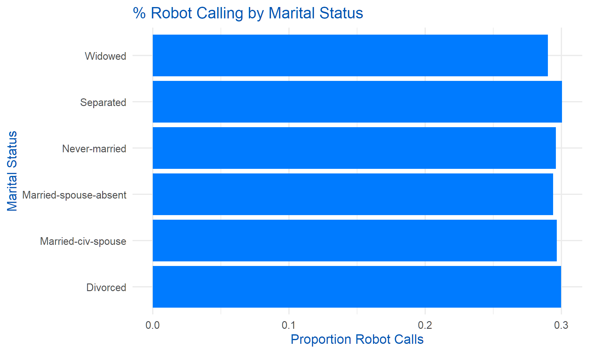 labs(title = "% Robot Calling by Marital Status", x = "Marital Status", y = "Proportion Robot Calls") +