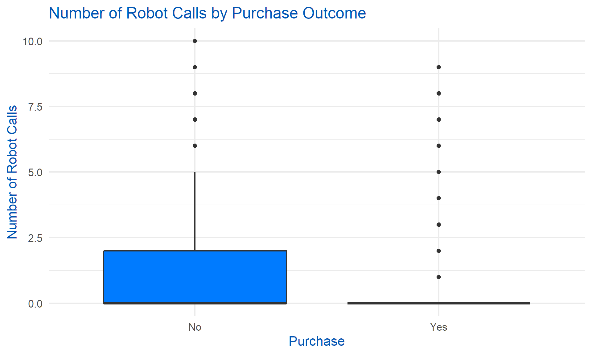 labs(title = "Number of Robot Calls by Purchase Outcome", x = "Purchase", y = "Number of Robot Calls") +
