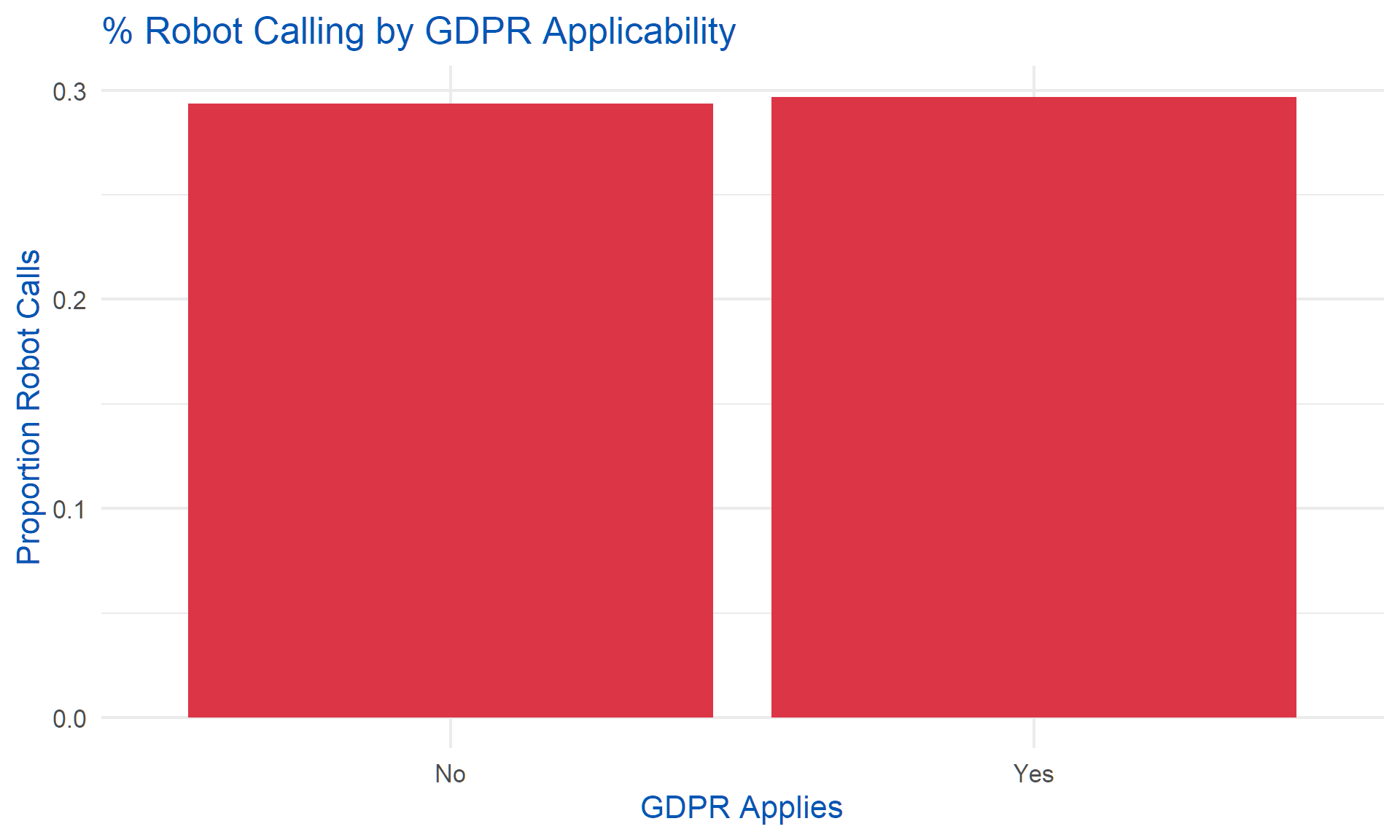labs(title = "% Robot Calling by GDPR Applicability", x = "GDPR Applies", y = "Proportion Robot Calls") +