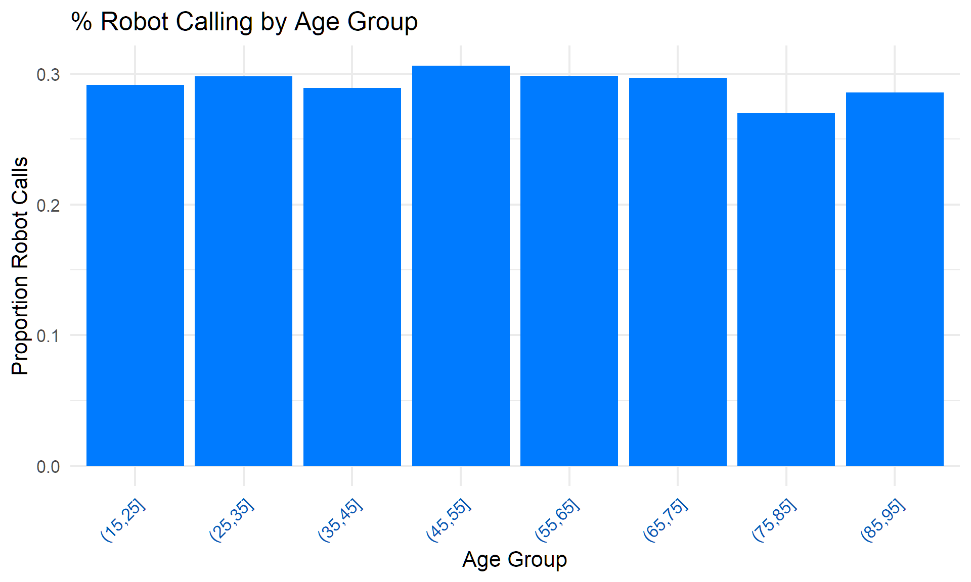 labs(title = "% Robot Calling by Age Group", x = "Age Group", y = "Proportion Robot Calls") +