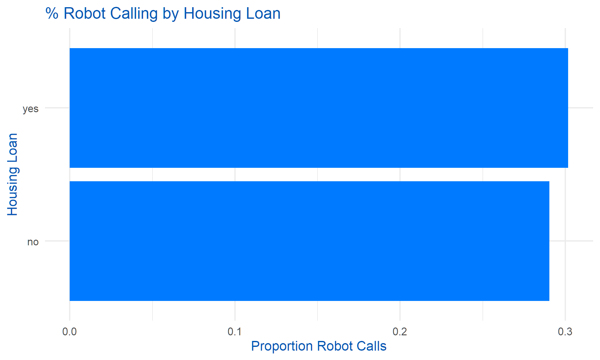 labs(title = "% Robot Calling by Housing Loan", x = "Housing Loan", y = "Proportion Robot Calls") +